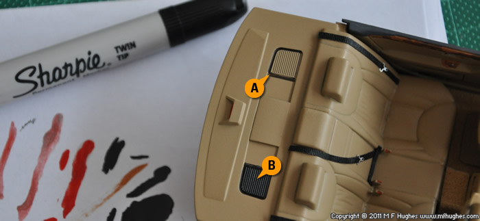 The final part of the lower interior half - the recessed outline of the speakers is traced with a Sharpie (A) , and the centre filled with Tamiya Flat Black acrylic. (B)