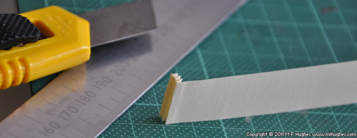 A slot in the last section was cut to provide access for the tape tie-back, and this is made simply from a strip of masking tape. One completed curtains is shown on the right. I then made 3 more just like this.