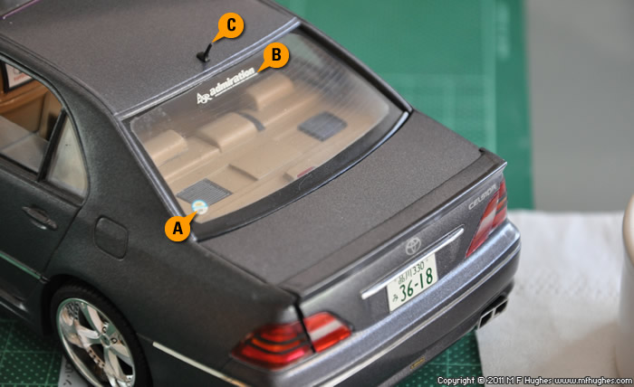 The rear window sticker (B), rear parking permit sticker (A) and rear number plate are applied. This also seems like a good time to glue the aerial in place (C). Note that even with the correct glass, the boot fitment isn't really that good.